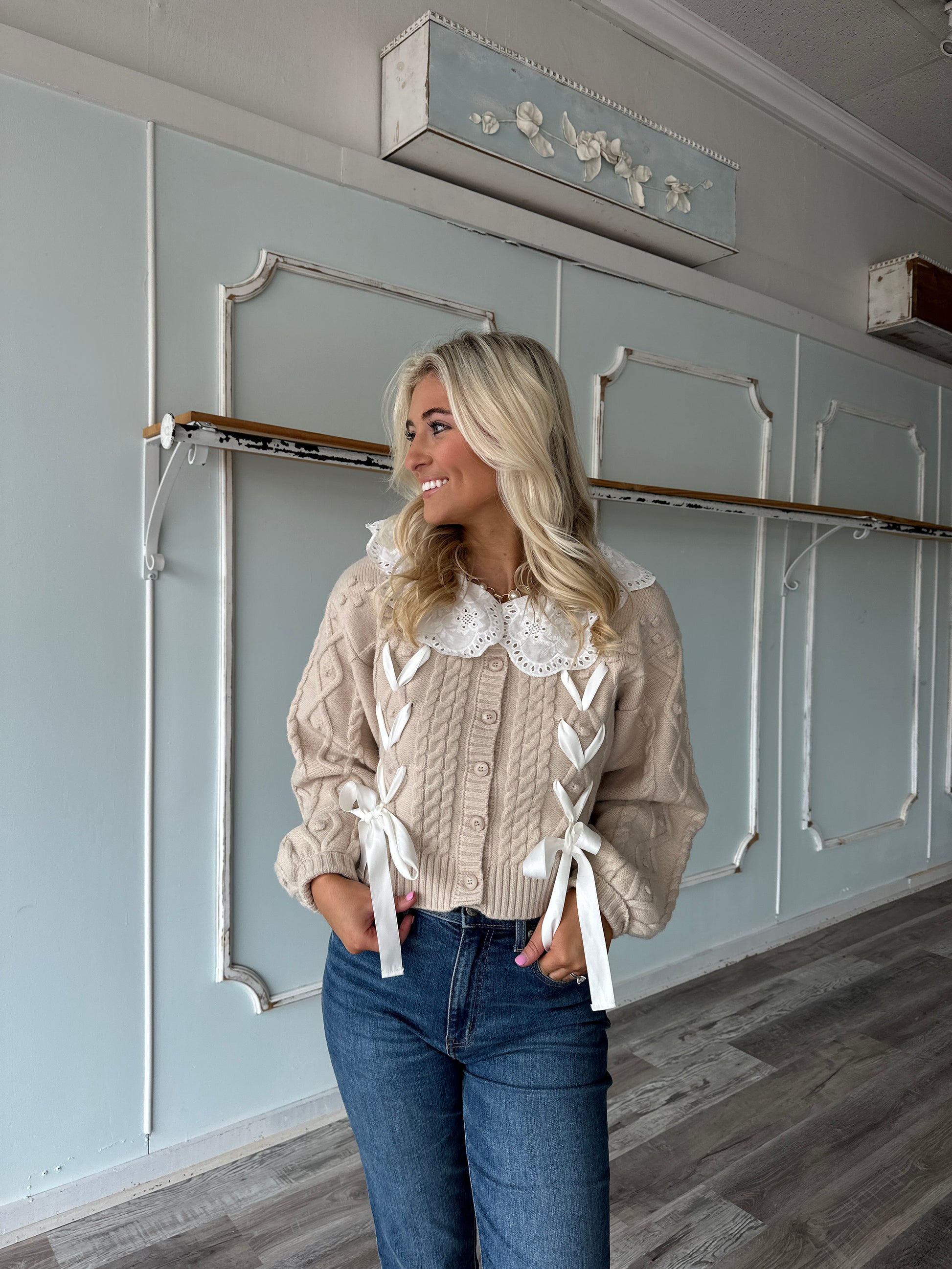Taupe Collar Cable Knit Cardigan